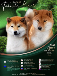5.03.2022г Родился помёт от пары Hamafuku Go Seiruu Hashimotosou & Meishuu No Himeko Go Seiryuu Hashimotosou. Регистрация FCI/ NIPPO.В помёте 3 мальчик и 2 девочки. Доступеных щенков нет!